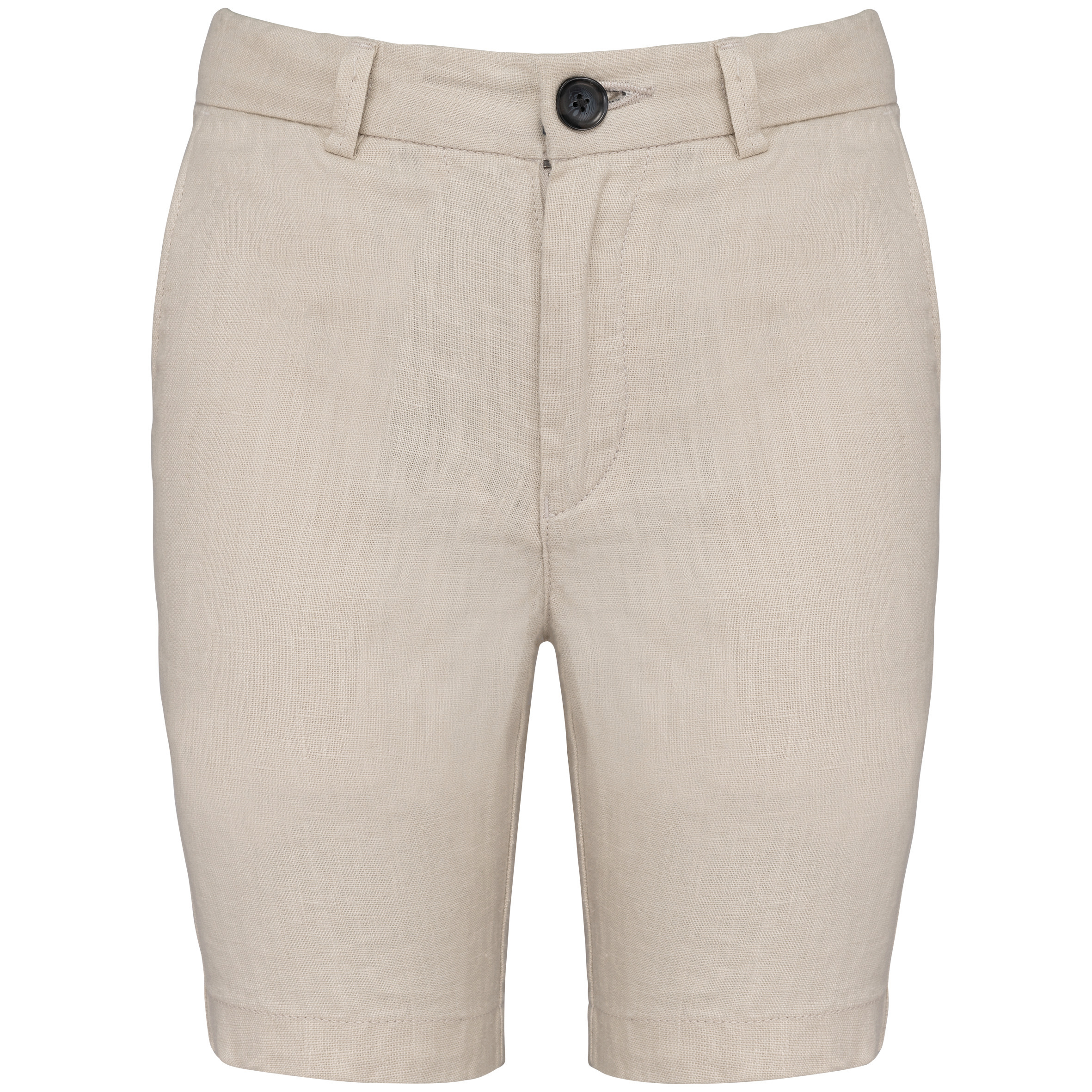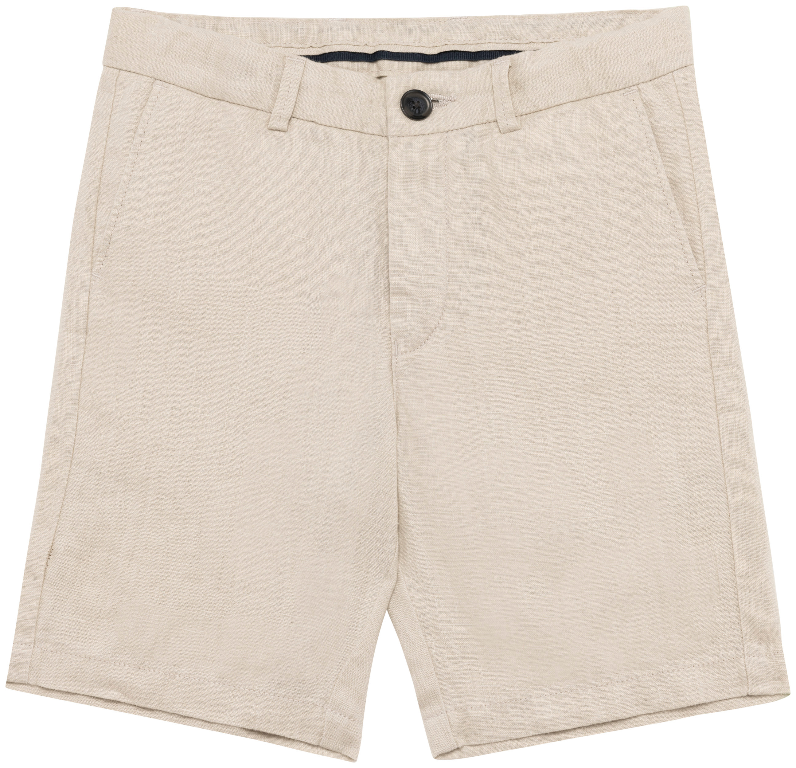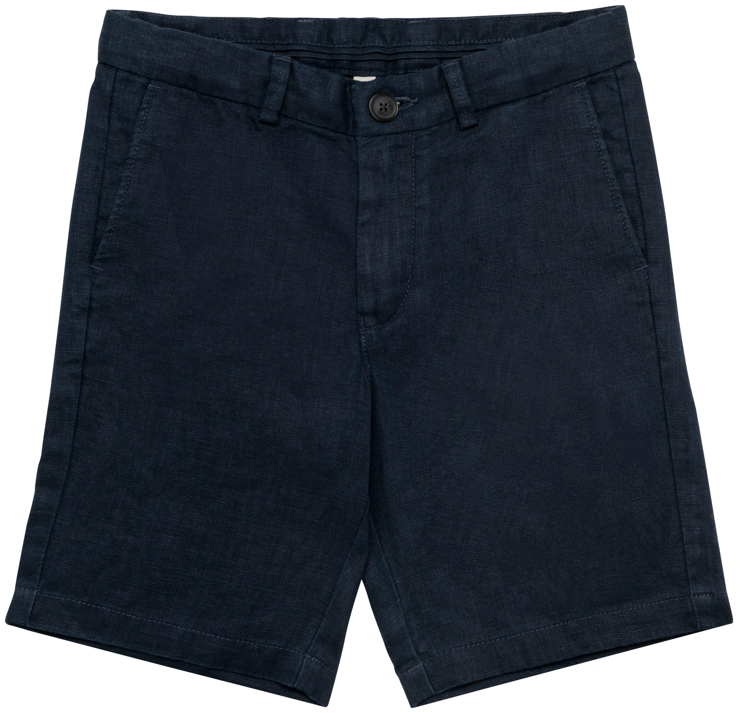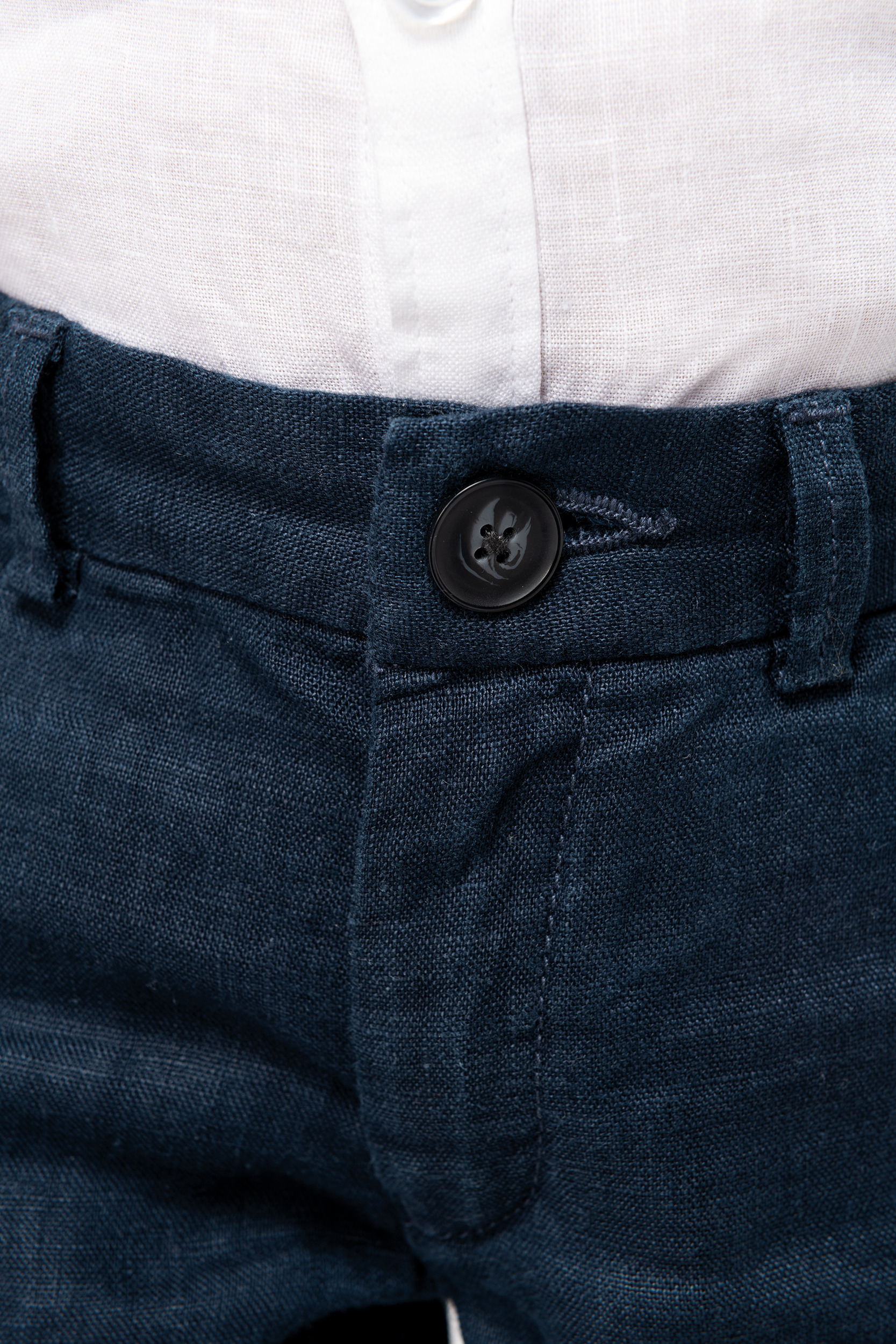 100% linho. Tecida. Cintura com presilhas, interior elástico e ajustável. Acabamento interno do cós com faixa inglesa azul marinho contrastante. Braguilha com botão em plástico reciclado com efeito marmoreado e fecho em metal reciclado. Dois bolsos frontais com pesponto. Dois bolsos traseiros placados com botão em plástico reciclado com efeito marmoreado. Fundo dos bolsos frontais e traseiros em chevron tom sobre tom. Pesponto na traseira e frontal para mais reforço. Acabamento das pernas com bainha simples. Peça lavada após montagem: as cores podem variar de produto para produto.