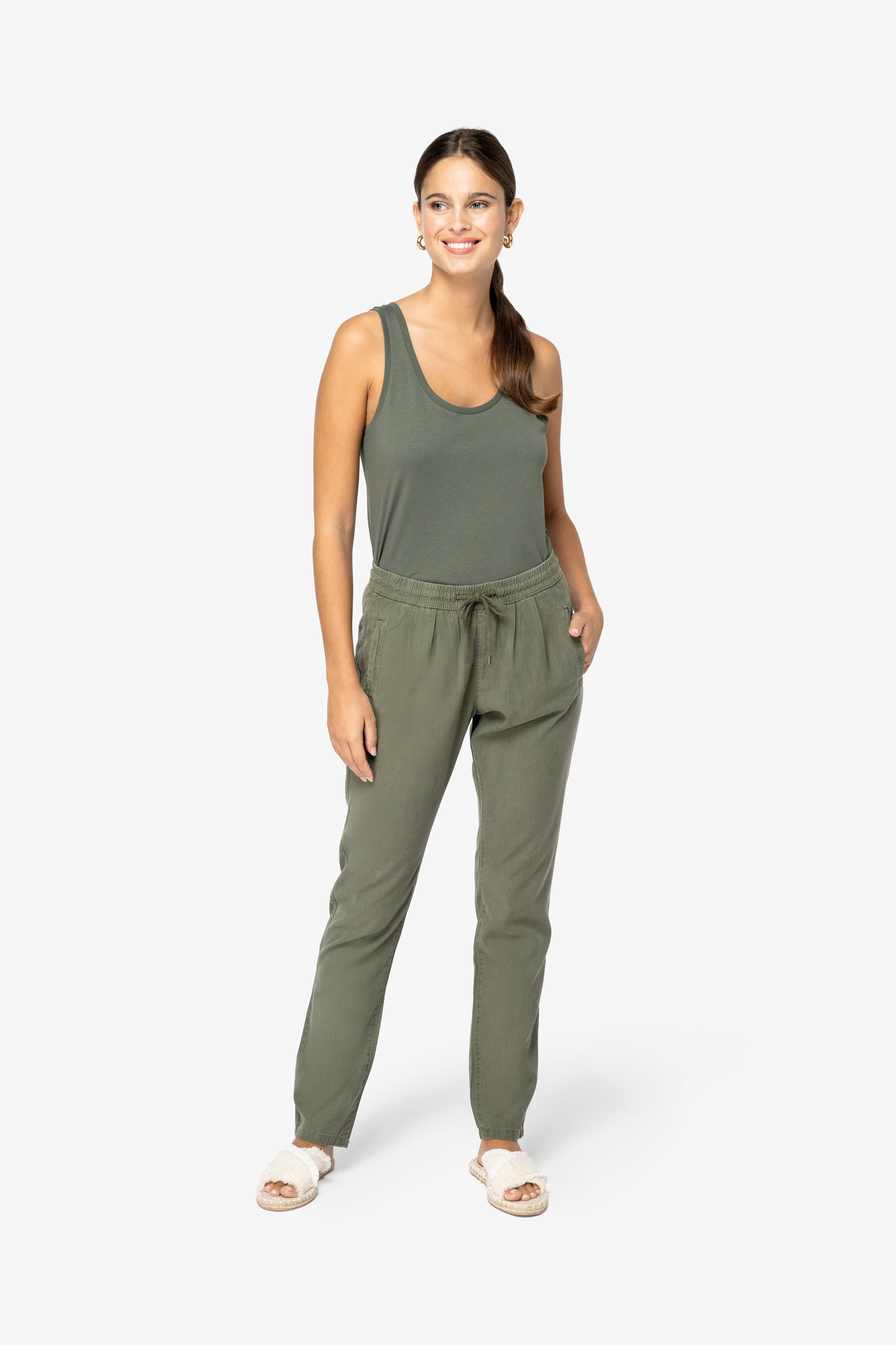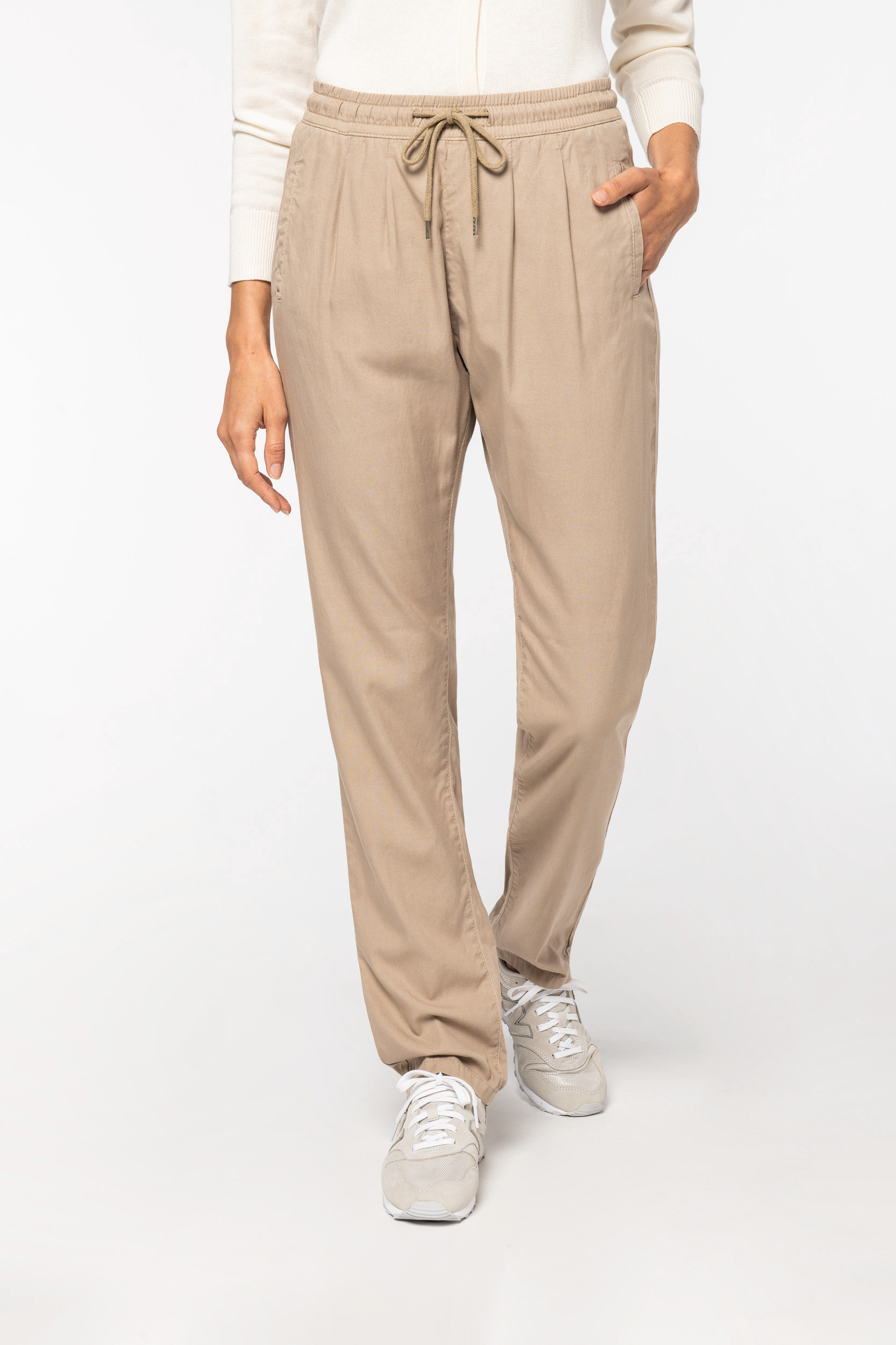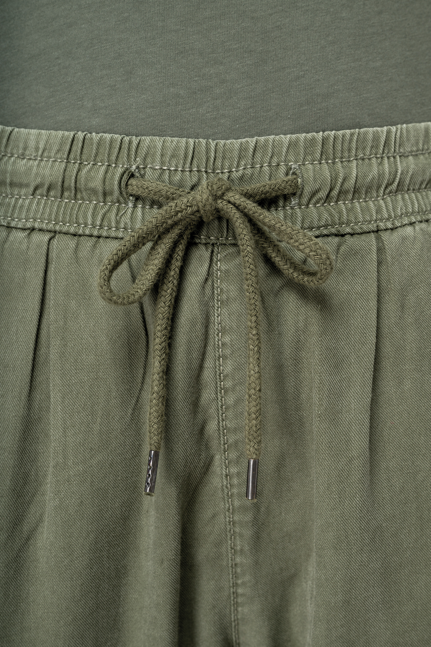 65% liocel TENCEL™ / 35% algodão biológico. Corte descontraído. Acabamento toque pele de pêssego. Cintura elástica com cordão de ajuste e pontas em metal. Dois bolsos frontais e traseiros com pesponto. Cantos dos bolsos reforçados. Costura com nervura à frente, nas costas, nas laterais e entrepernas. Este produto é susceptível de tingir em contacto com superfícies ou peças de roupa claras.