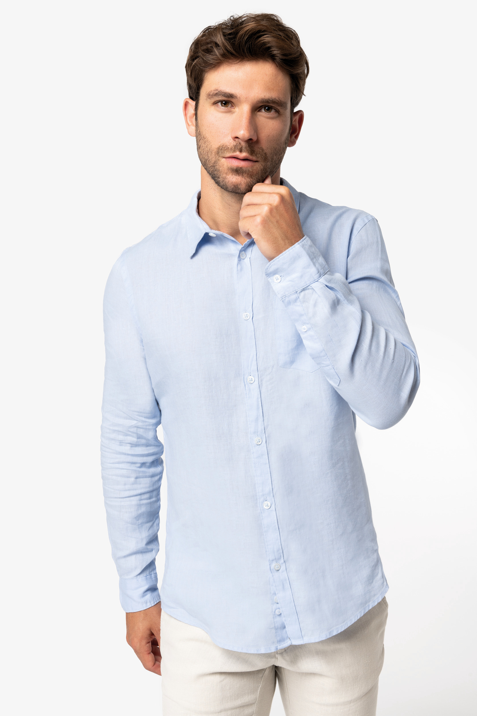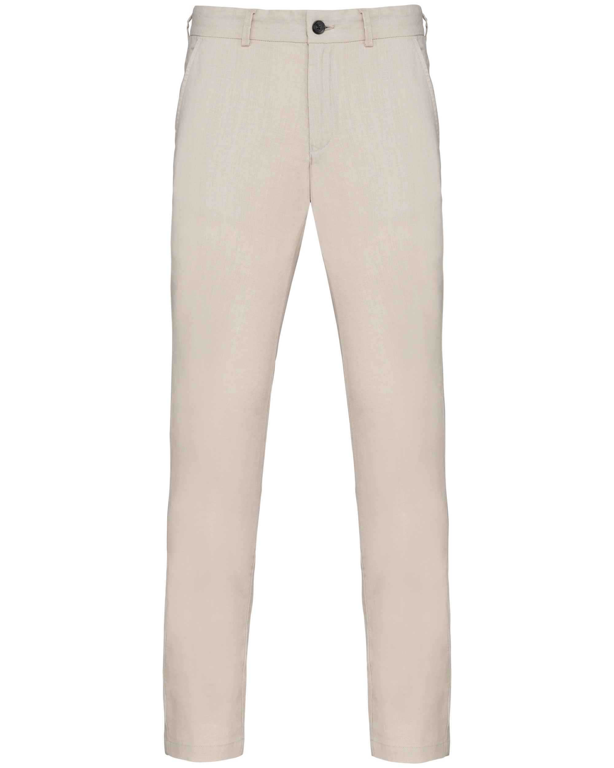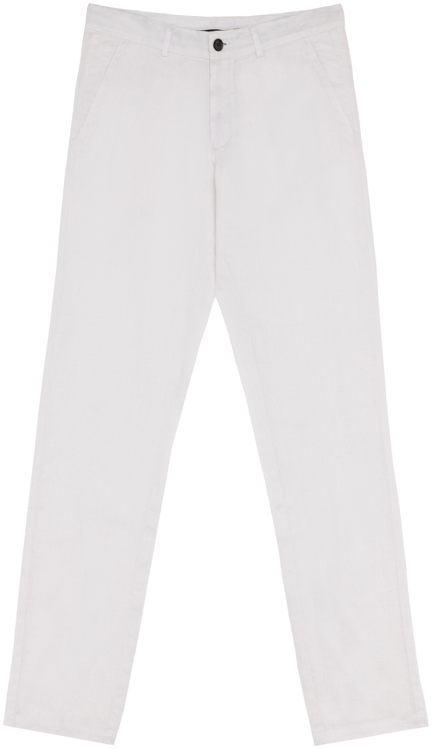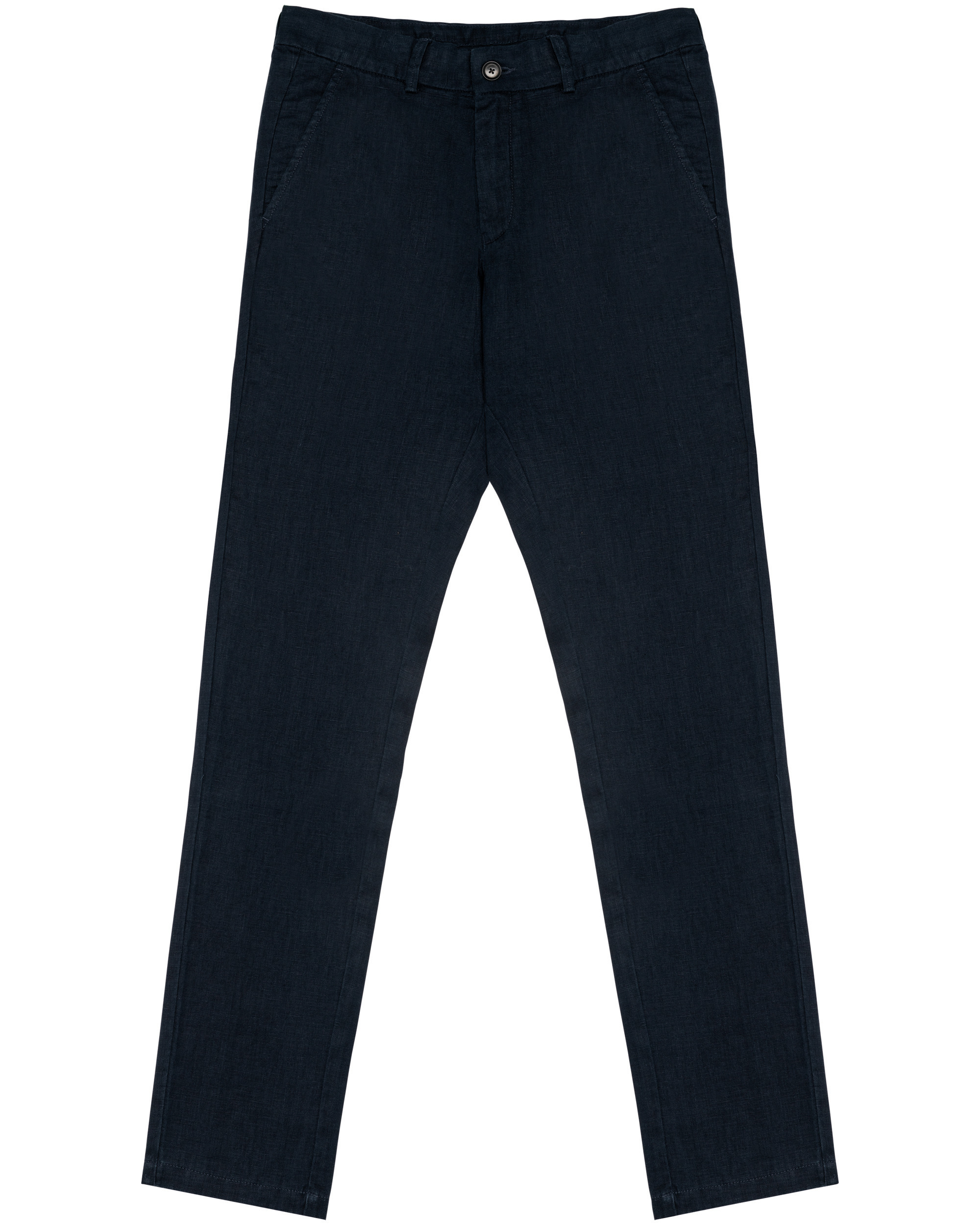 100% linho. Tecida. Cintura com presilhas e acabamento interior com contraste de cor azul marinho. Braguilha com botão em plástico reciclado com efeito marmoreado e fecho em metal reciclado. Dois bolsos frontais com pesponto. Dois bolsos traseiros placados com botão em plástico reciclado com efeito marmoreado. Fundo dos bolsos frontais e nas traseiros em chevron tom sobre tom. Pesponto triplo na parte traseira e frontal para maior reforço. Acabamento das pernas com bainha simples. Peça lavada após montagem: as cores podem variar de produto para produto.