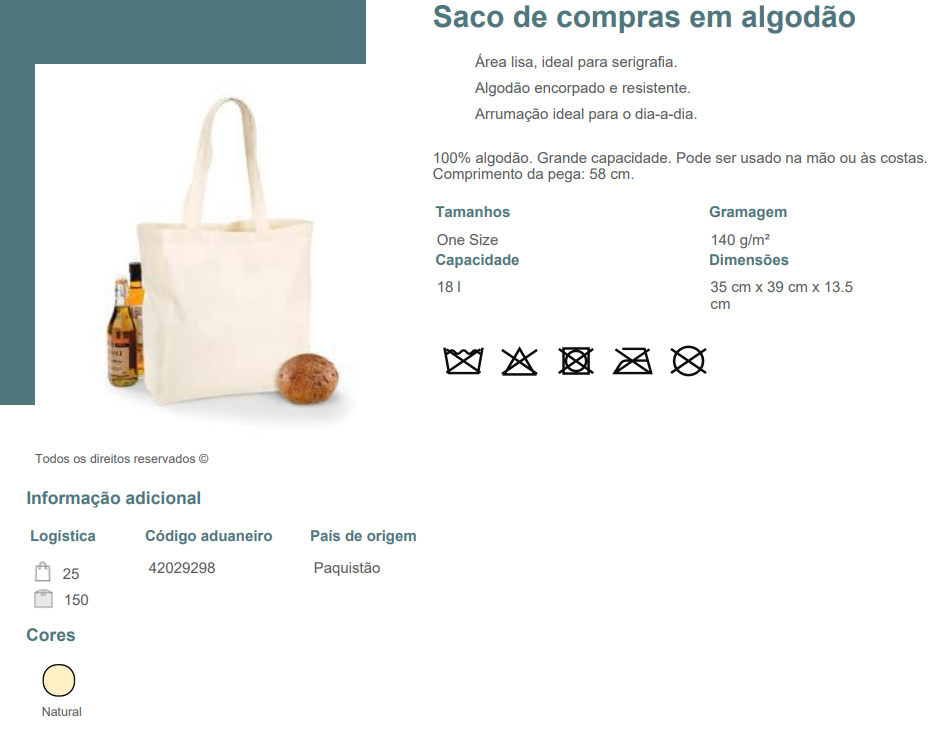 100% algodão. Grande capacidade. Pode ser usado na mão ou às costas. Comprimento da pega: 58 cm.