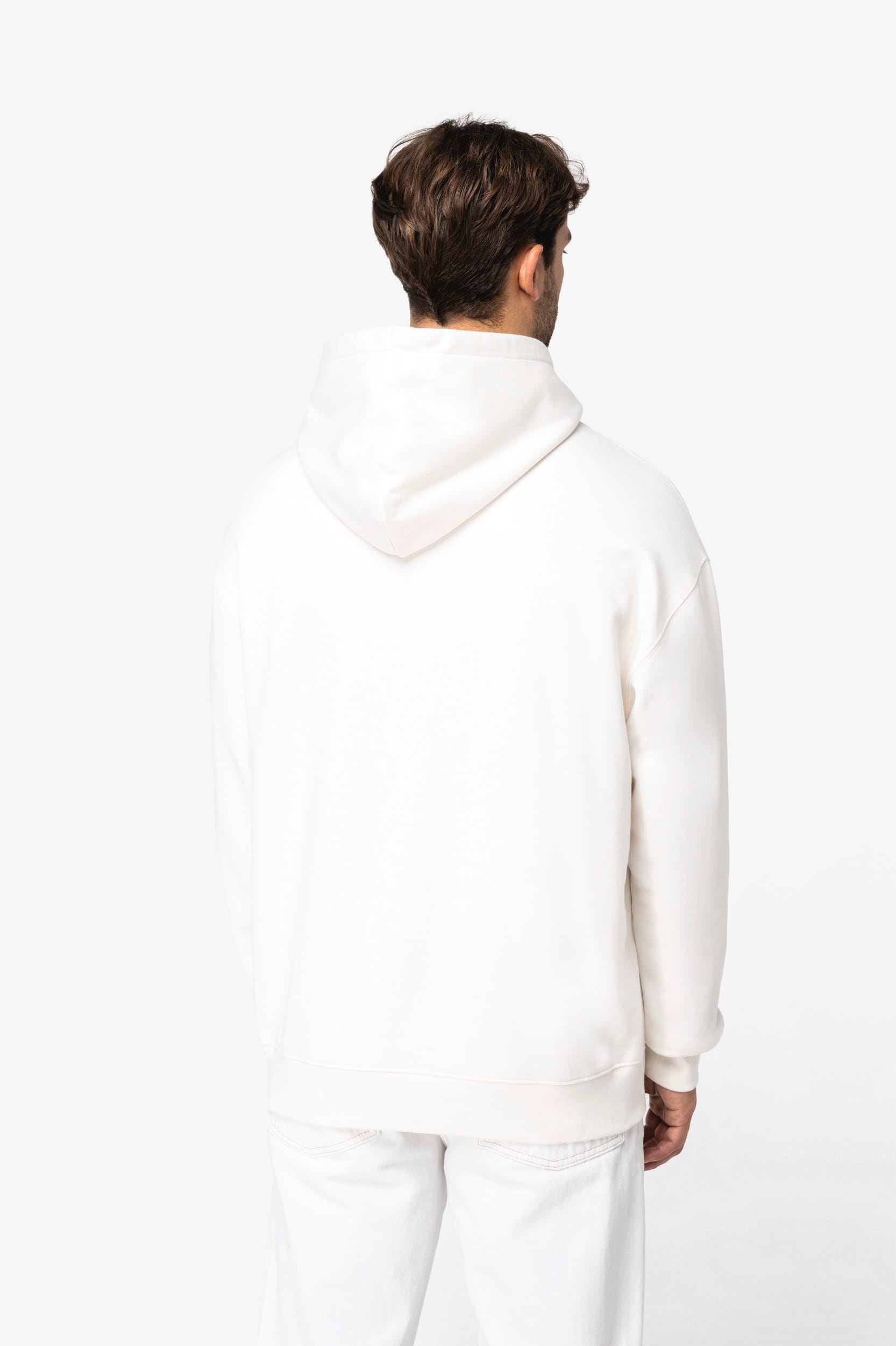 100% algodão biológico. Algodão penteado. Com banho de enzimas. Interior 3 fios cardado. Meia-lua nas costas. Bolso à canguru. Capuz forrado no tecido principal tom sobre tom. Pesponto à volta do capuz para segurar o cordão. Cordão plano em algodão biológico com pesponto. Tapa-costuras em jersey tom sobre tom no interior do decote. Punhos e cós em malha rib 1 x 1, montagem tubular para melhor acabamento. Pesponto simples na abertura do bolso.