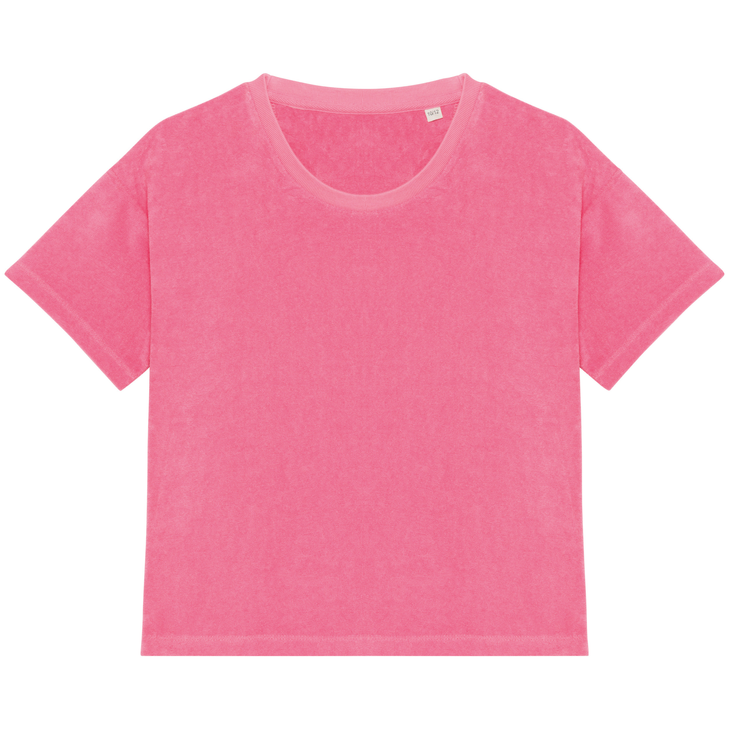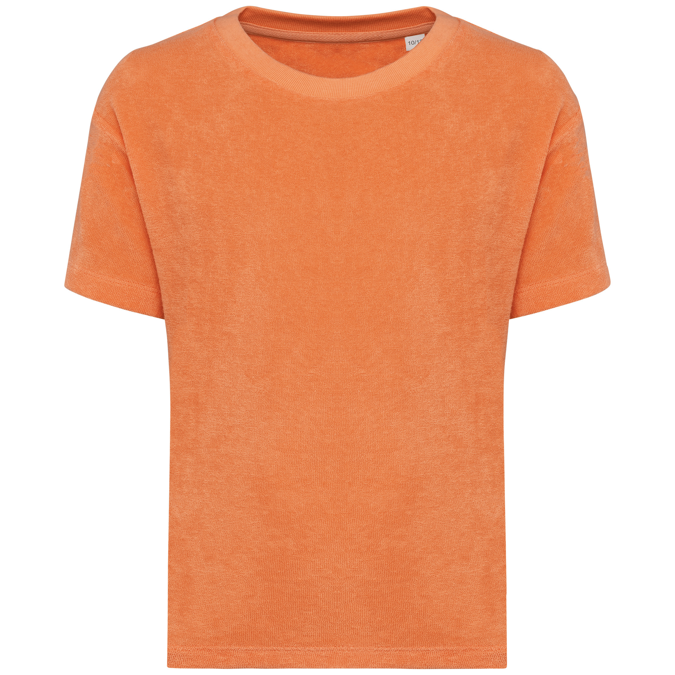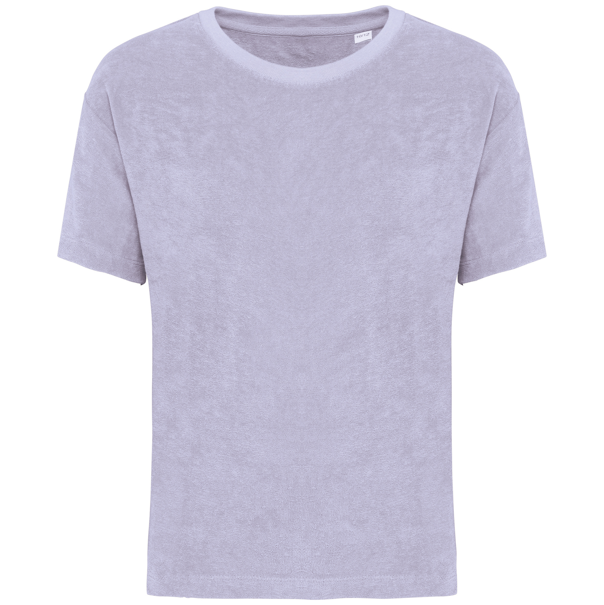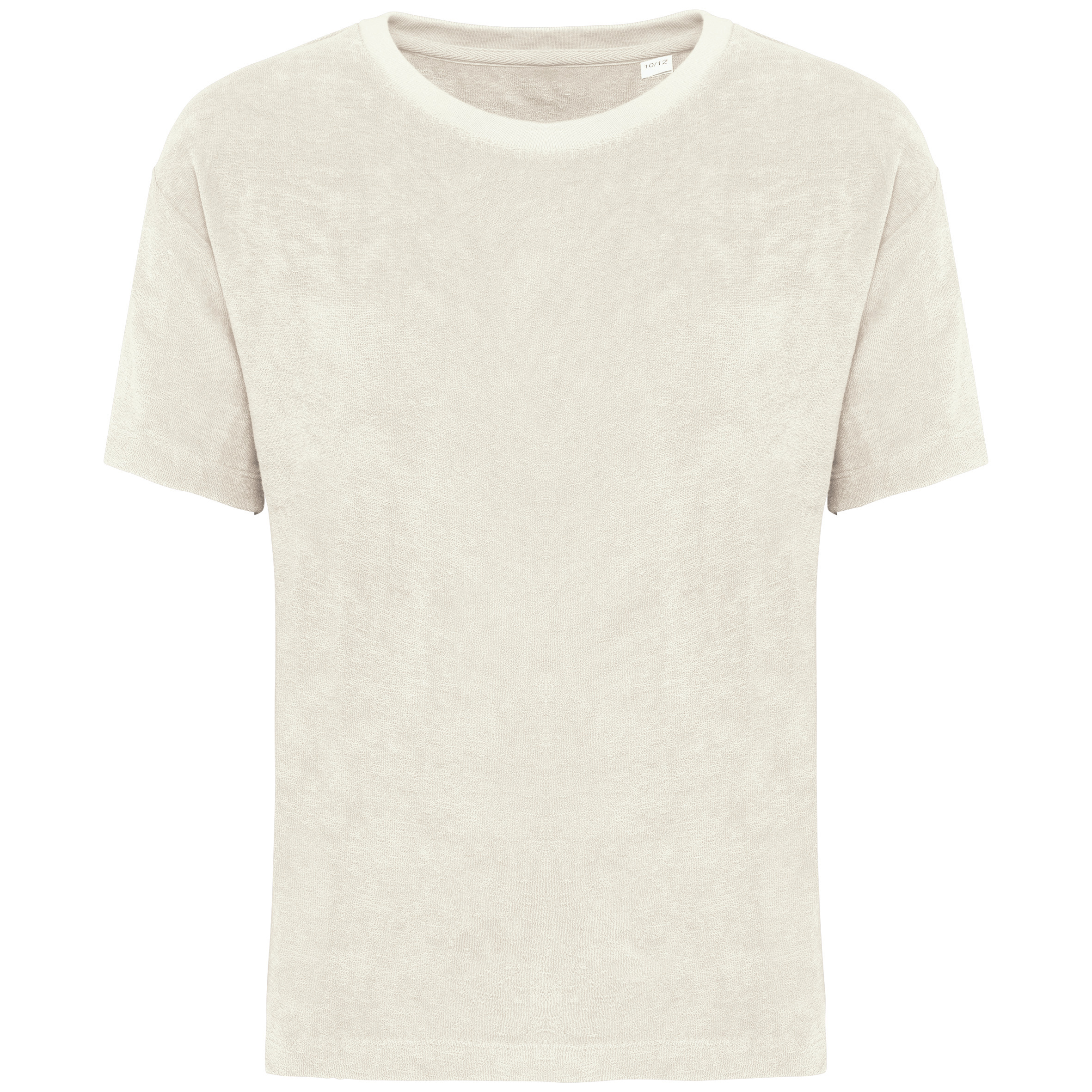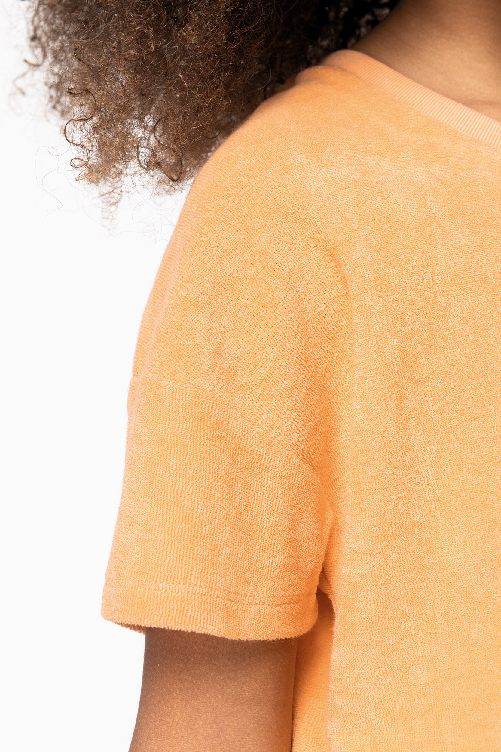 Fabricada em Portugal. 80% algodão biológico / 20% poliéster reciclado pós-consumo. Algodão penteado. Material turco. Corte direito com mangas descaídas. Costuras laterais. Com banho de enzimas. Meia-lua nas costas. Decote redondo com decote em malha rib 1 x 1. Acabamento do decote com tapa-costuras em chevron tom sobre tom. Reforço dos ombros no material principal. Costura dupla nas mangas e na bainha. Aberturas laterais com acabamento interior em chevron tom sobre tom.