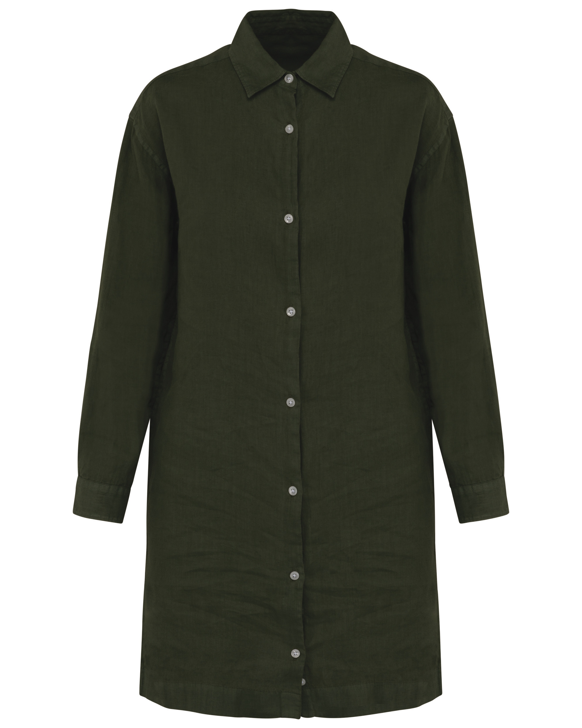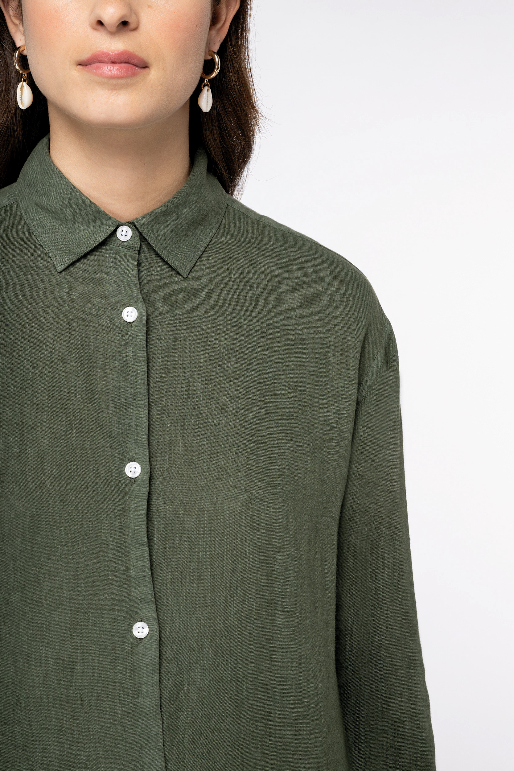 100% linho. Tecido. Corte confortável com ombros descaídos. Gola. Carcela com botões em plástico reciclado branco efeito nacarado. Encaixe nas costas forrado com prega. Punhos com abertura e botões. Aberturas laterais para maior liberdade de movimentos. Costura simples na bainha. Peça lavada após montagem: as cores podem variar produto para produto. Certificação em curso.
